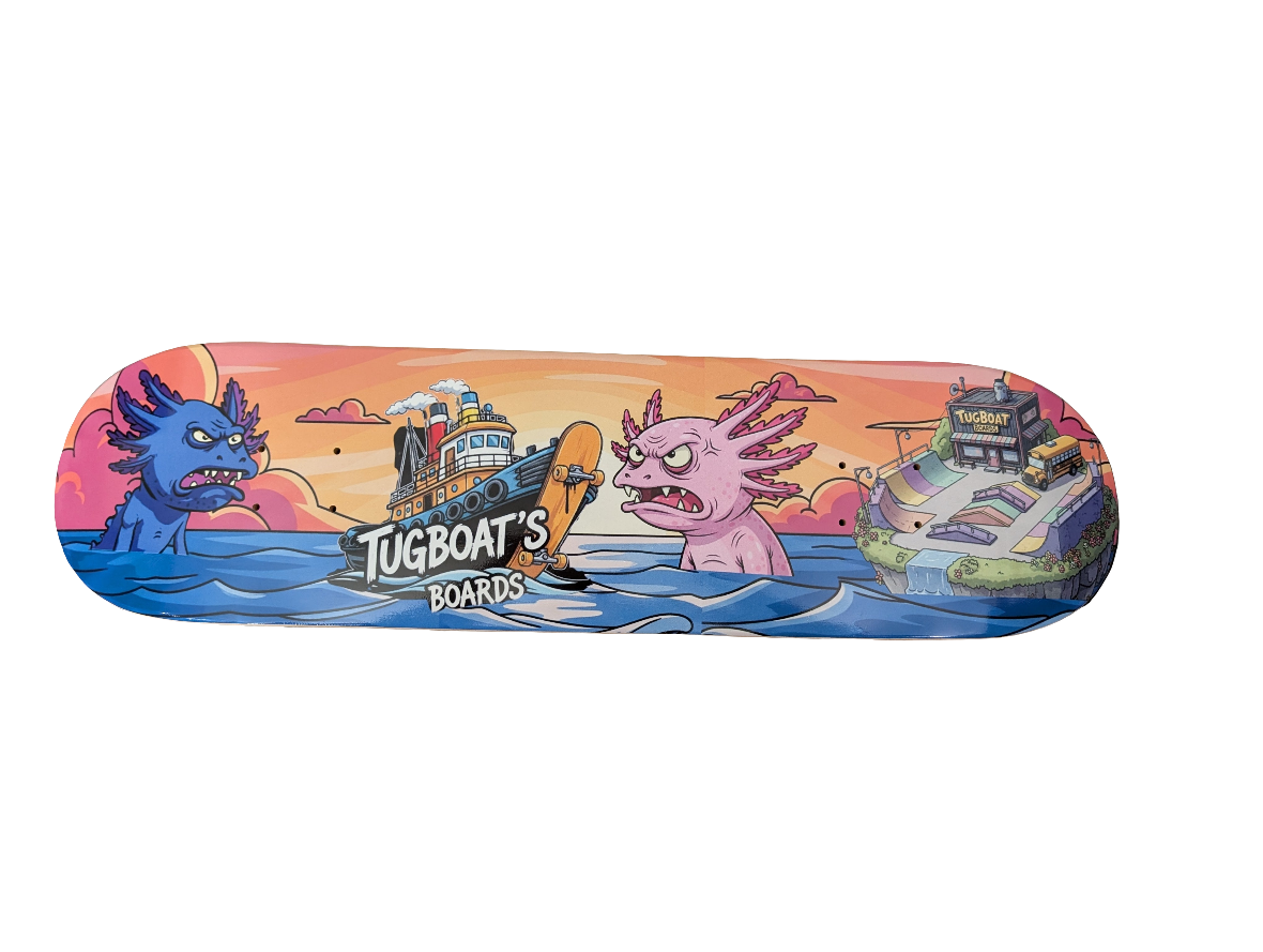 Tugboat's signature graphic! This graphic symbolizes tugboat's journey. . . The axolotlzilla from the back and the axolotlzilla from the front are the past and future challenges he has and is going to face. The island is a symbol of his goals and dreams! Nothing can stop this Boat from tuggin along to it's Island